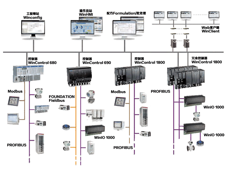 Winmation Control System 系统分为操作员级和过程控制级。操作员级包含了操作和显示、归档和记录、趋势及报警等基本功能。同时也可实现配方管理、批处理管理和信息管理等扩展功能。与现场执行器和传感器进行通信的控制器来执行开环和闭环回路控制功能。